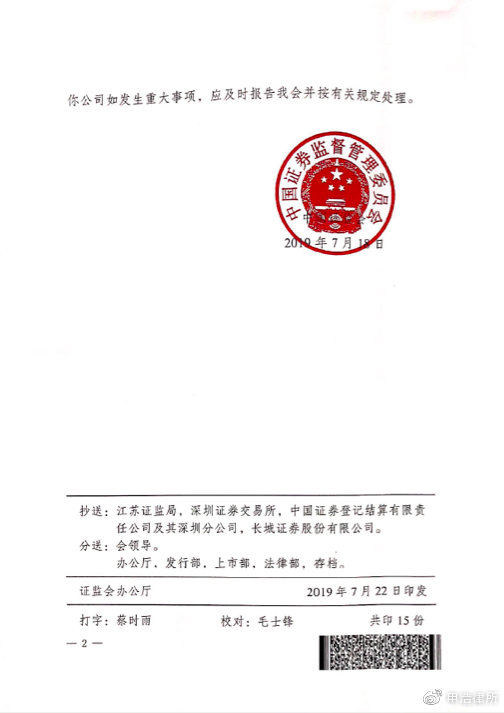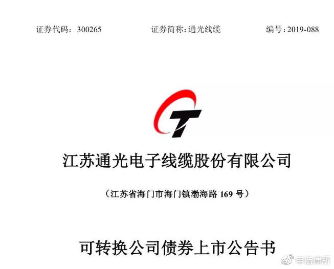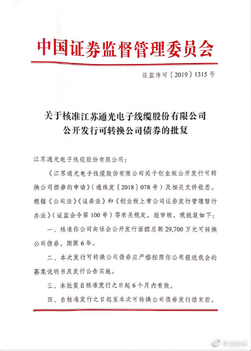 江蘇東光電子ケーブル有限公司(以下、「東光ケーブル」という)はこのほど、「江蘇東光電子ケーブル有限公司による転換社債の公募発行の承認に関する回答」を受け取りました。中国証券監督管理委員会(以下「CSRC」という)が発行した認可(CSRCライセンス[2019]第1315号)を取得し、2019年11月28日に深セン証券取引所に上場した。承認を受けて、東倉ケーブルは額面100元の転換社債297万本を公募発行し、発行総額は2億9,700万元となった。